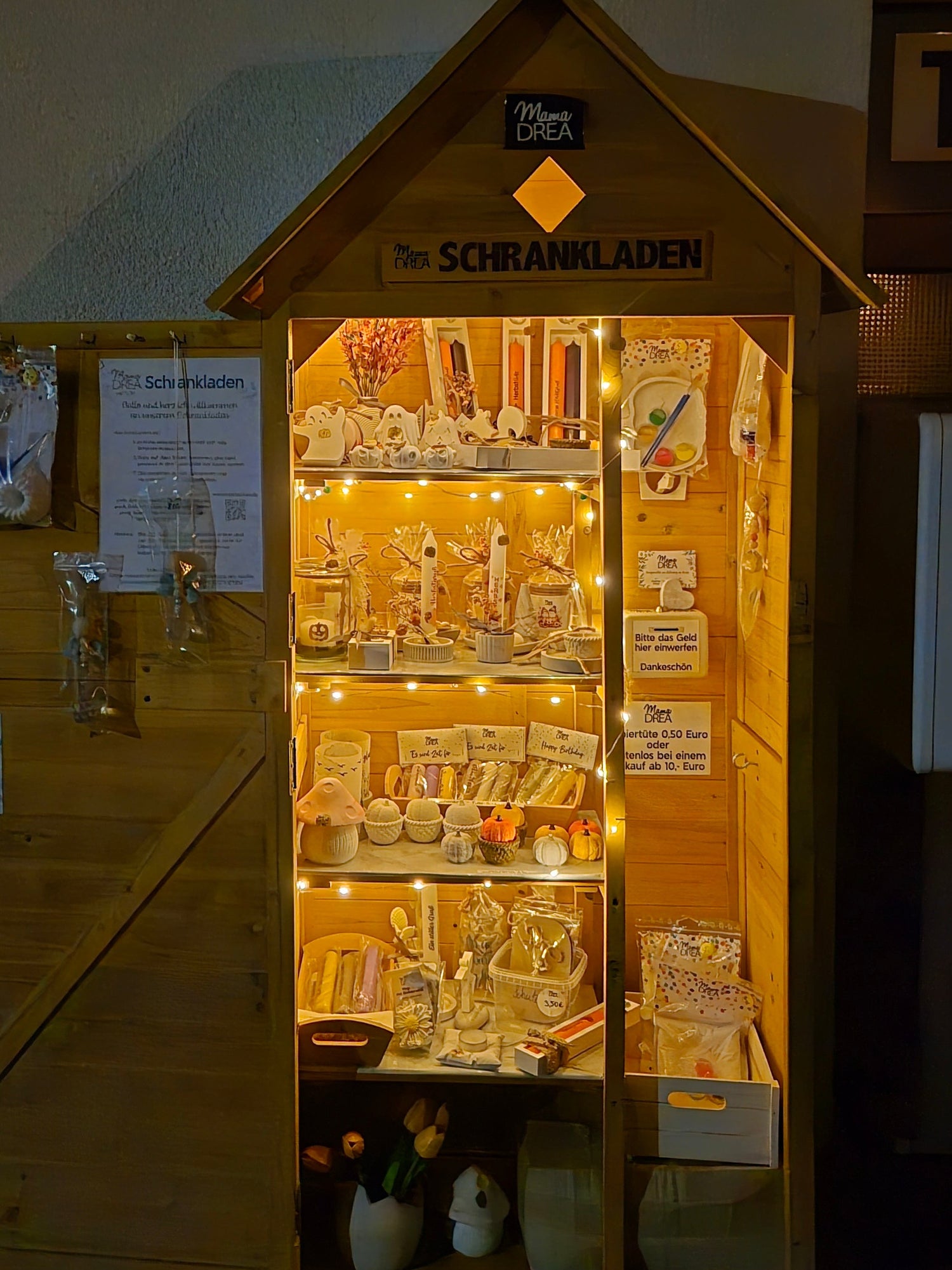 jetzt in der dunklen Jahreszeit könnt ihr mit einer gemütlich leuchtenden Lichterkette an unserem Schrankladen stöbern und euch tolle Dekoartikel kaufen.