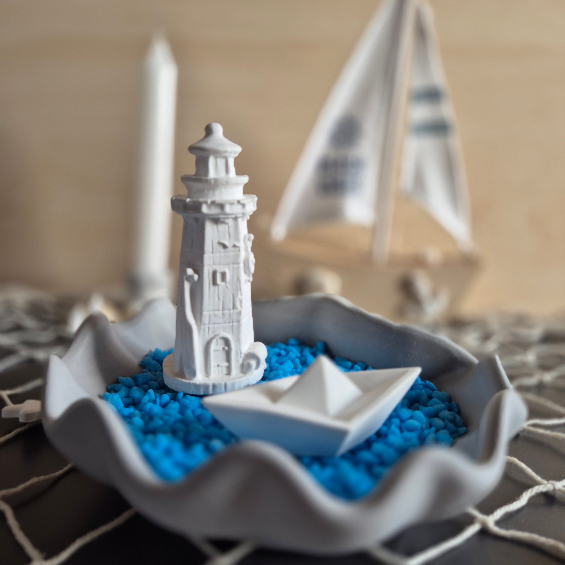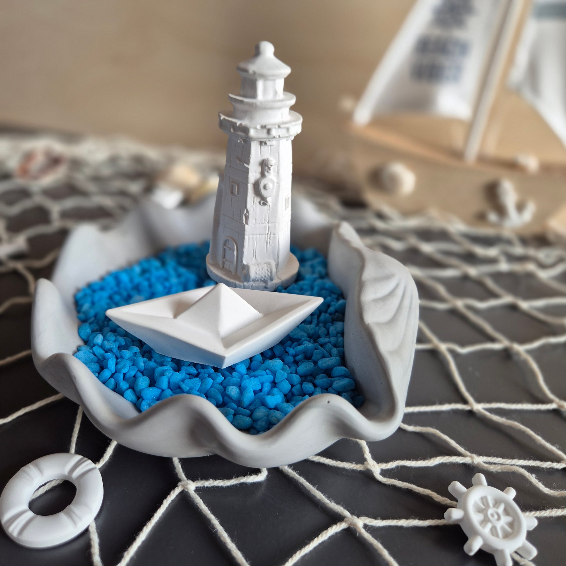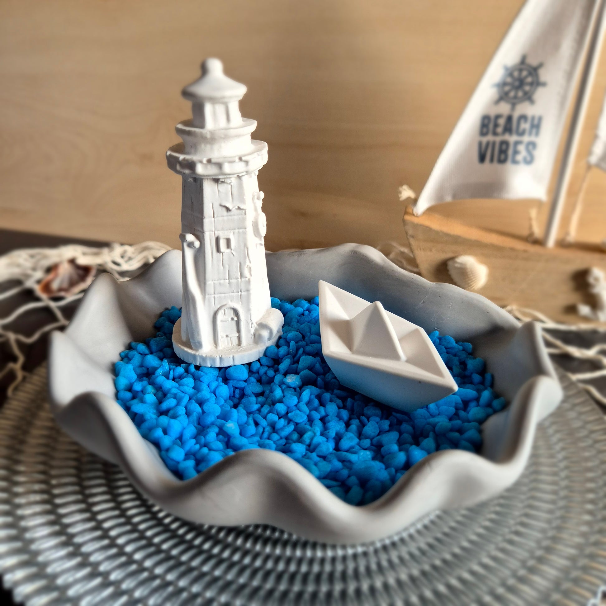 Sehr dekorative Schale im Form einer großen Muschel, die gefüllt mit blauem Dekosand einen echtes Schmuckstück auf dem Tisch oder dem Regal ergibt. Der Leuchtturm und das kleine Boot machen den Eindruck, als ob sie im blauen Wasser schwimmen.