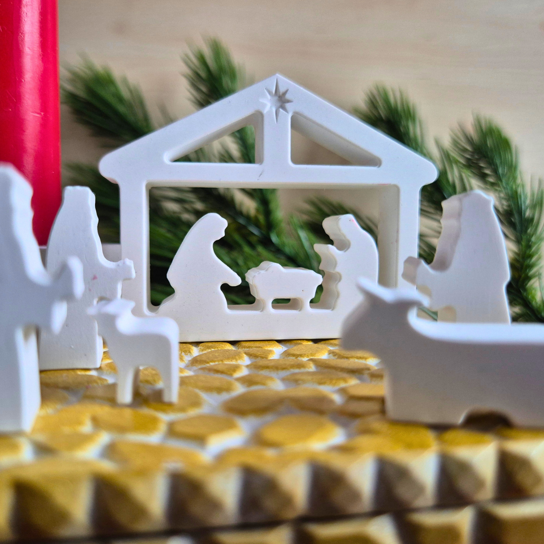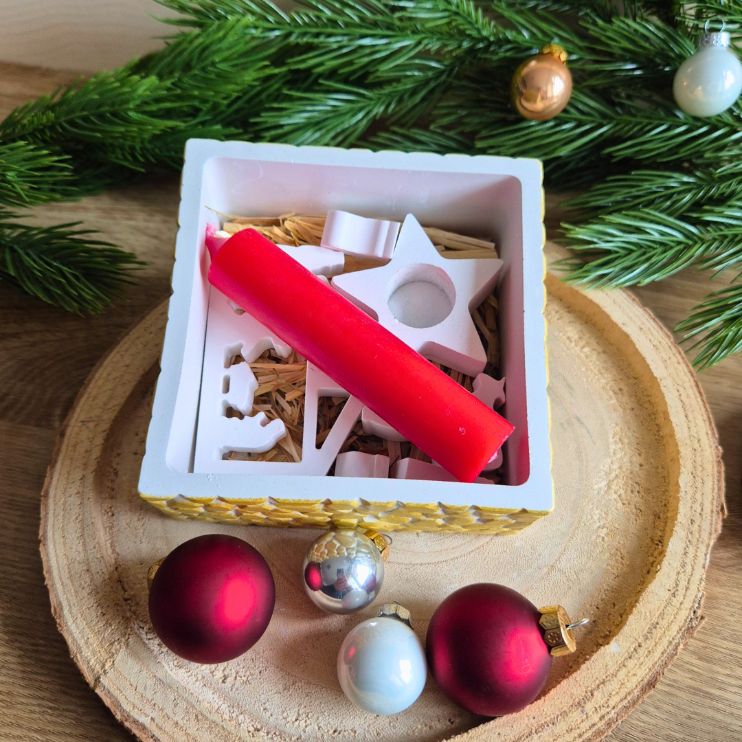Kleine Krippenszene mit allen Figuren, einem Kerzenständer in Sternform und einer 10cm hohen Stabkerze - perfekt passend in die Goldbox. Ideal zum verschenken.