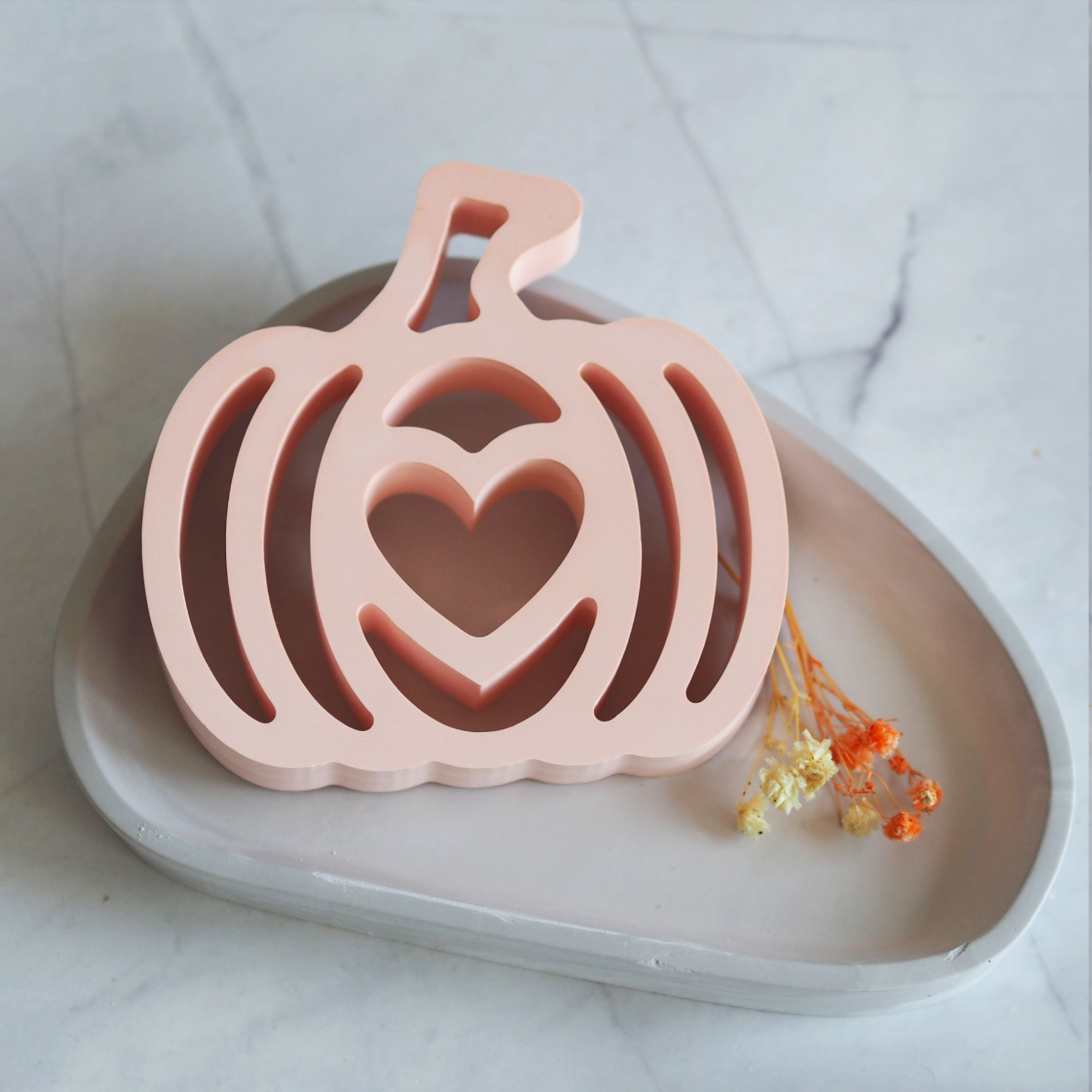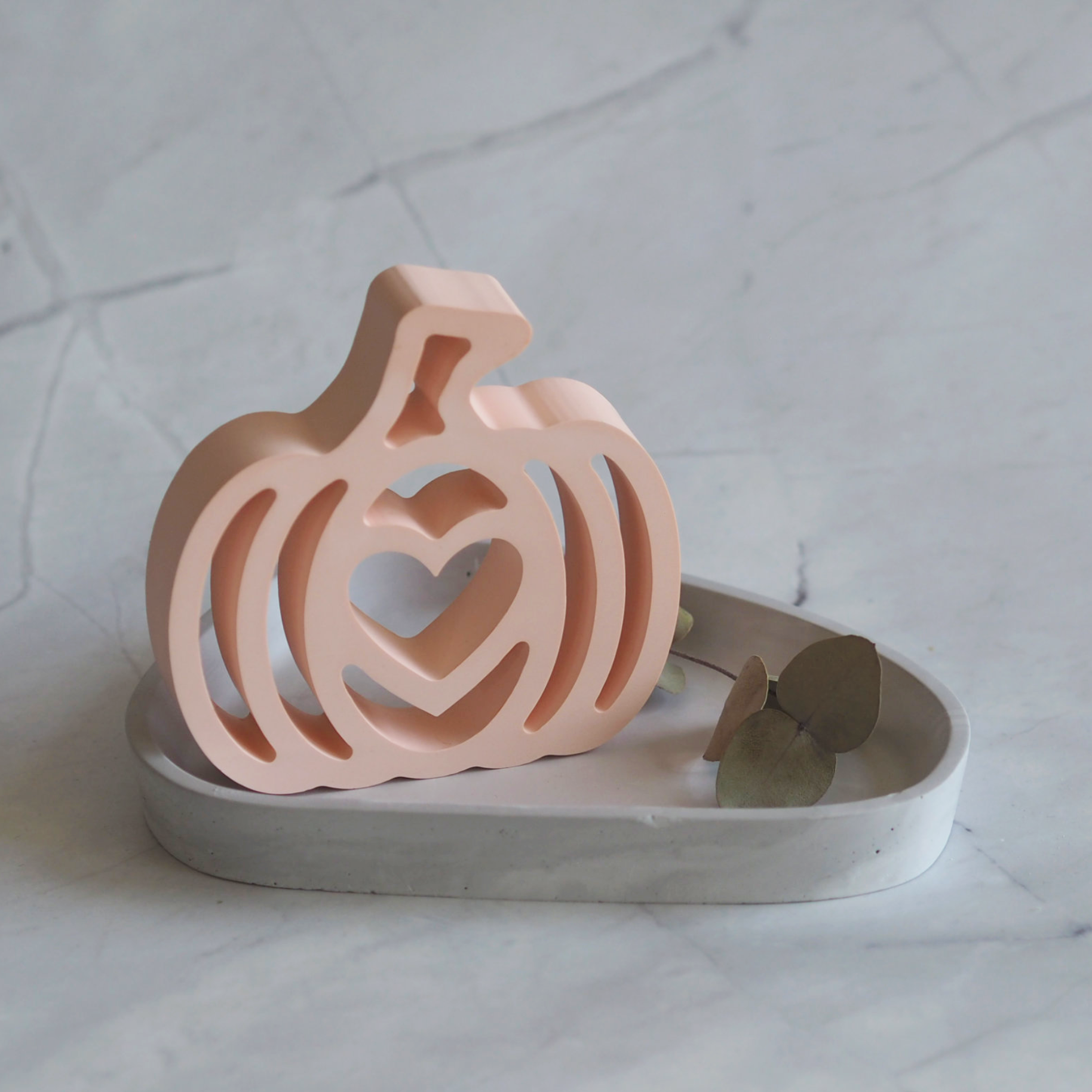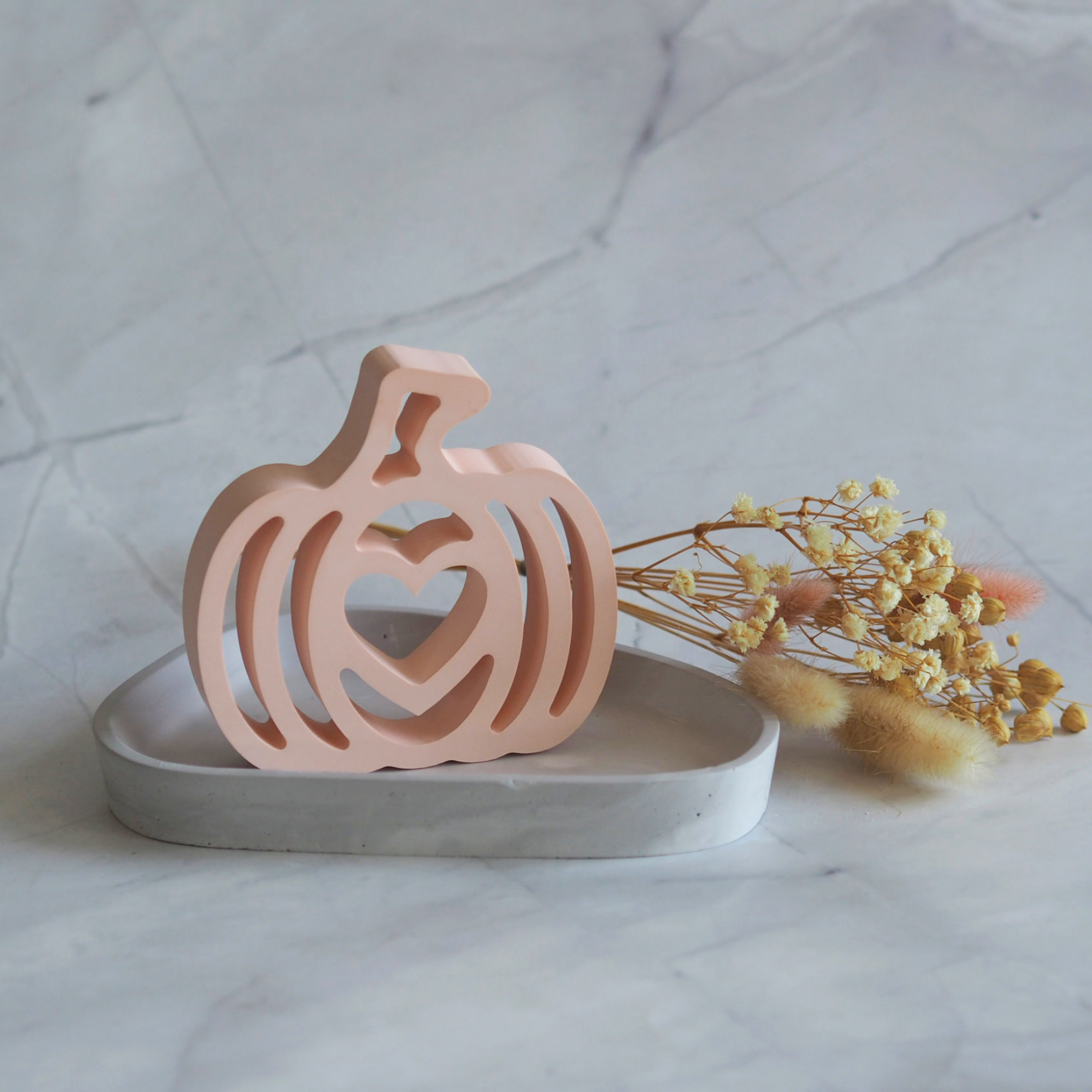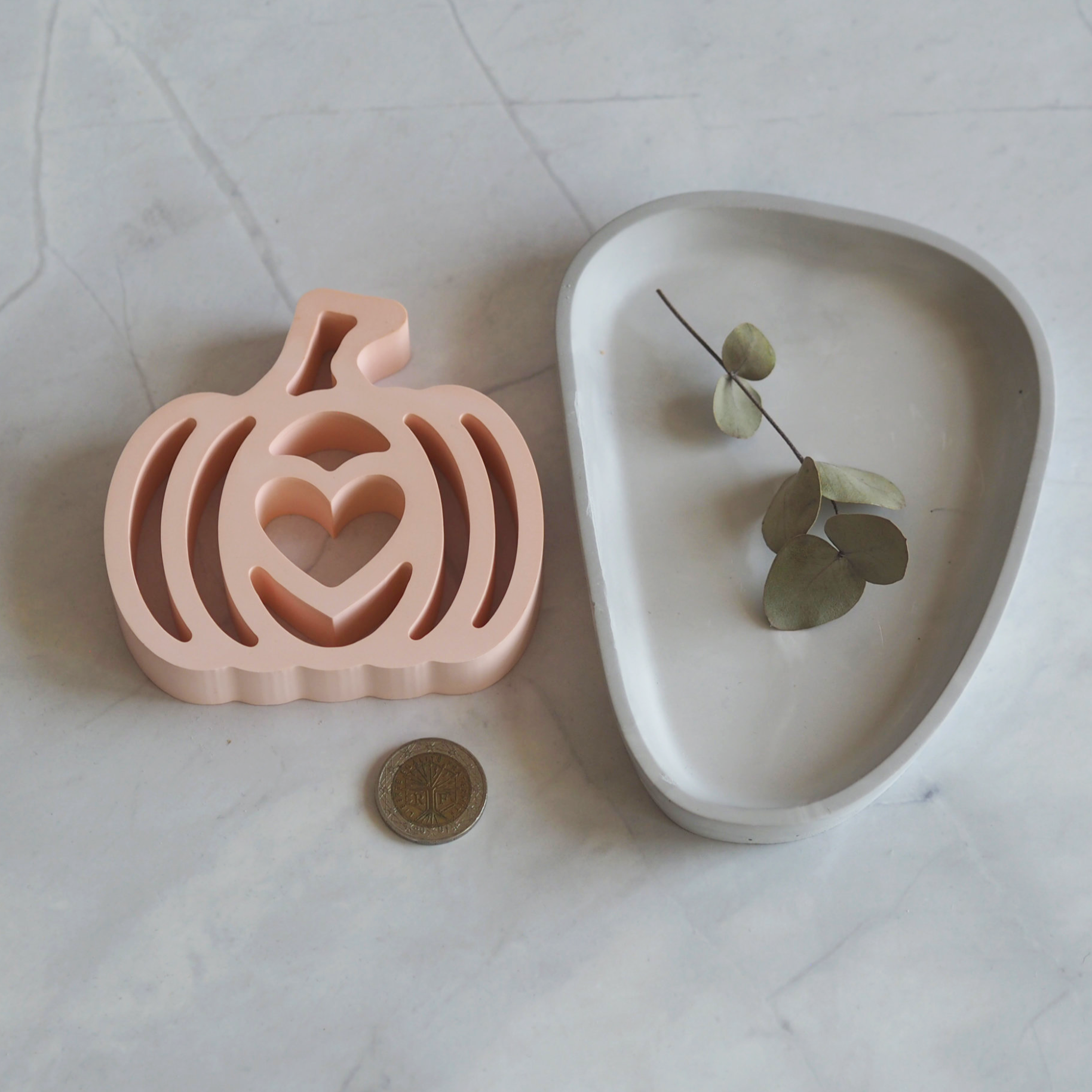Dieser schlichte Kürbis aus orangem Gießmaterial ist mit seinem kleinen Herz im der Mitte ein Hingucker für jedes Wohnzimmer. Auf dem eleganten grauen Dekoteller in abgerundeter Dreiecksform bringt er herbstliche Wärme und Gemütlichkeit in Ihr Zuhause.