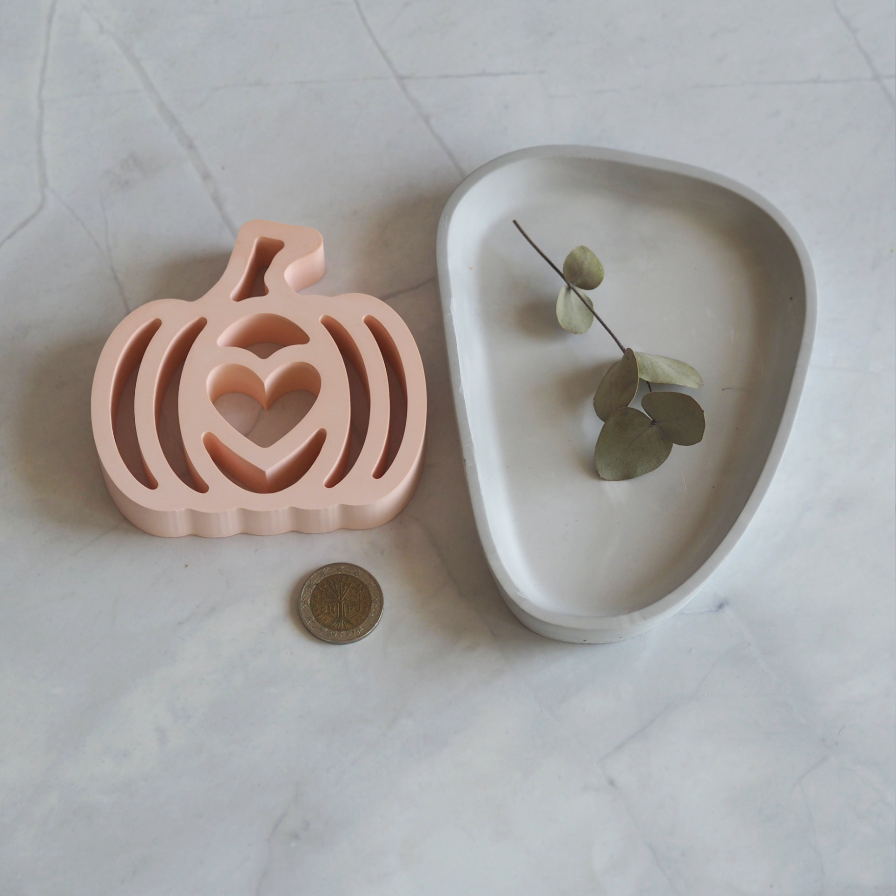 Der Kürbis hat eine Abmessung von ca. 11,0 auf 11,0 cm und ist 2,0 cm tief, somit kann er sicher stehen. Der Dekoteller mit der abgerundeten Dreiecksform ist mit 13,0 cm auf 17,0 cm ein perfekter Partner für die Kürbisform.