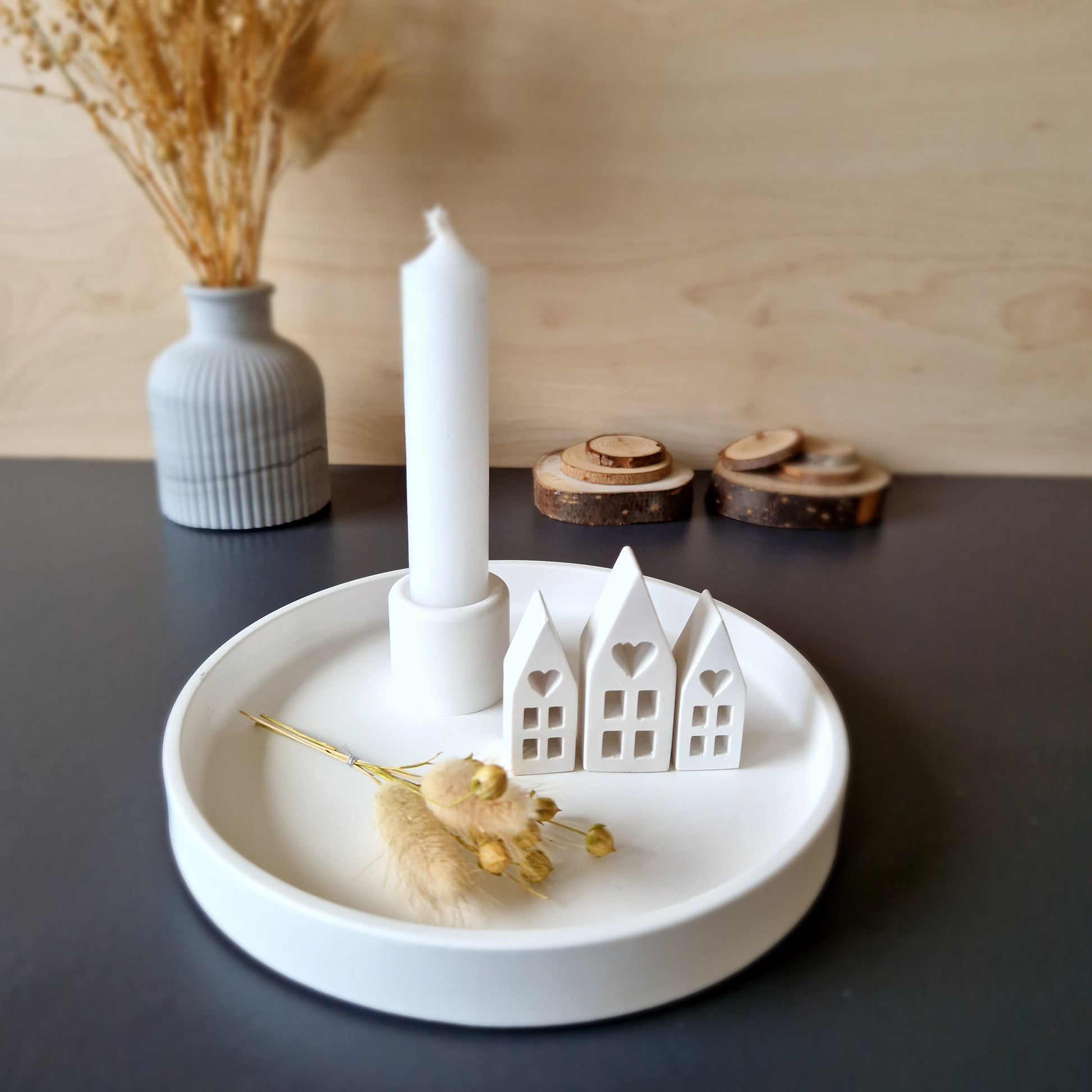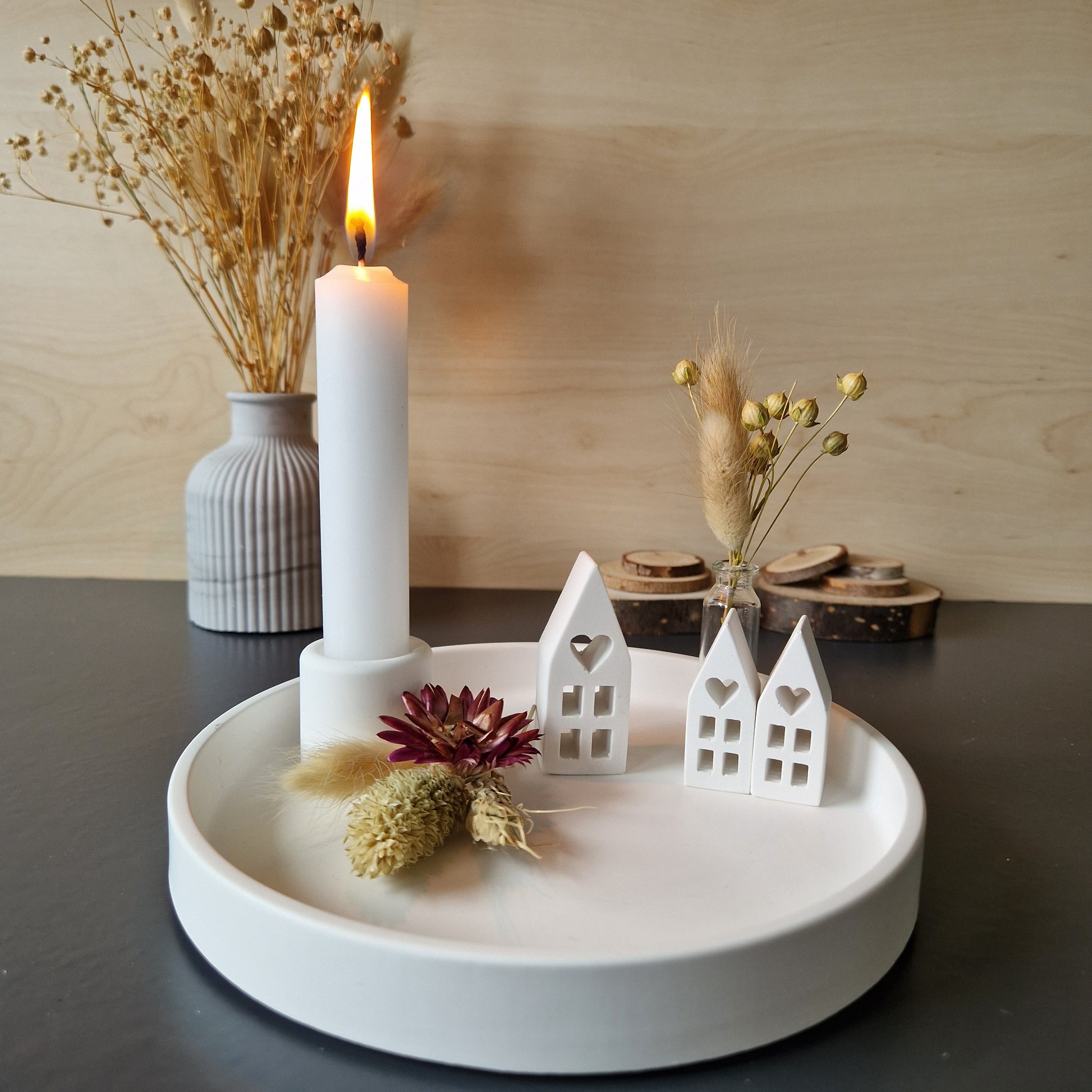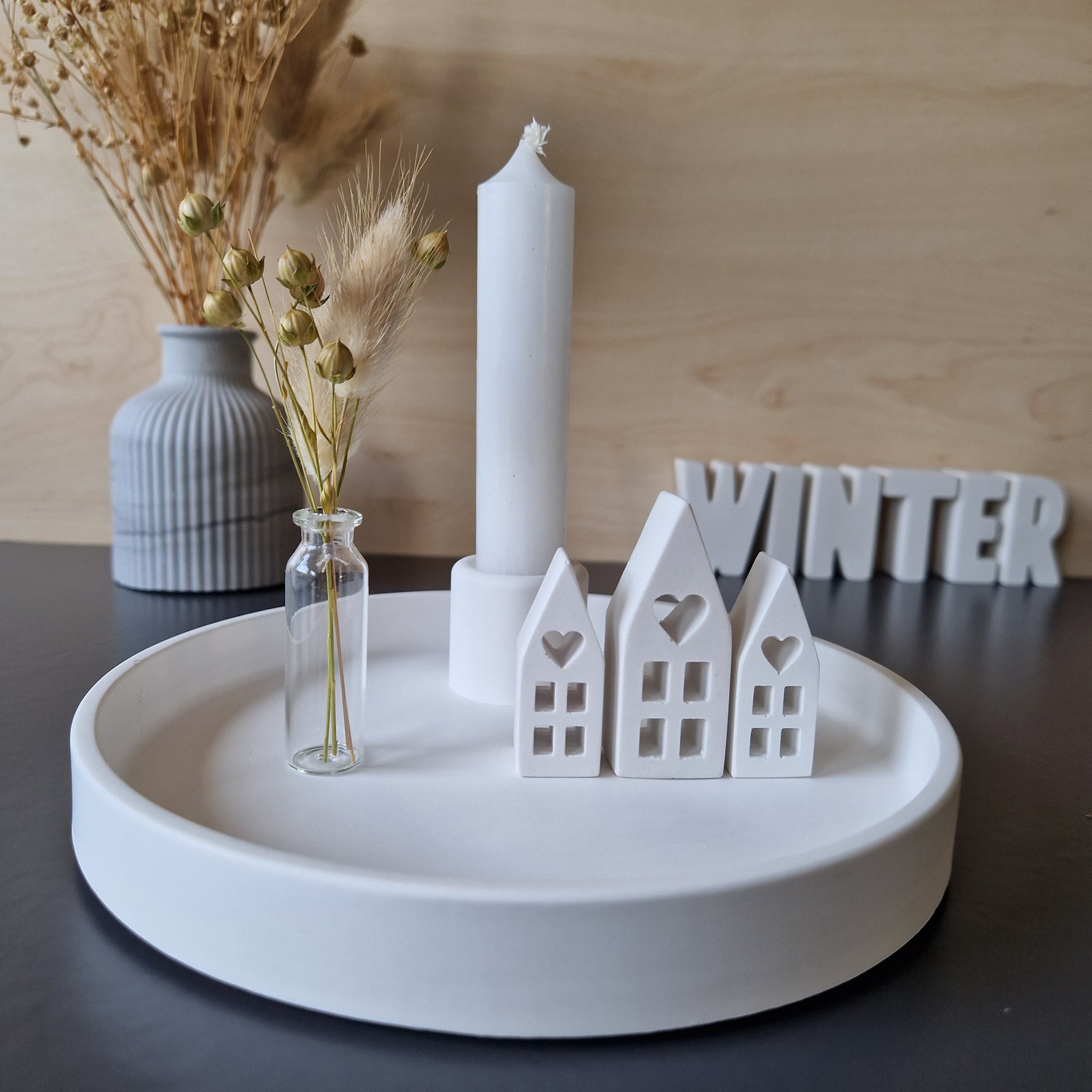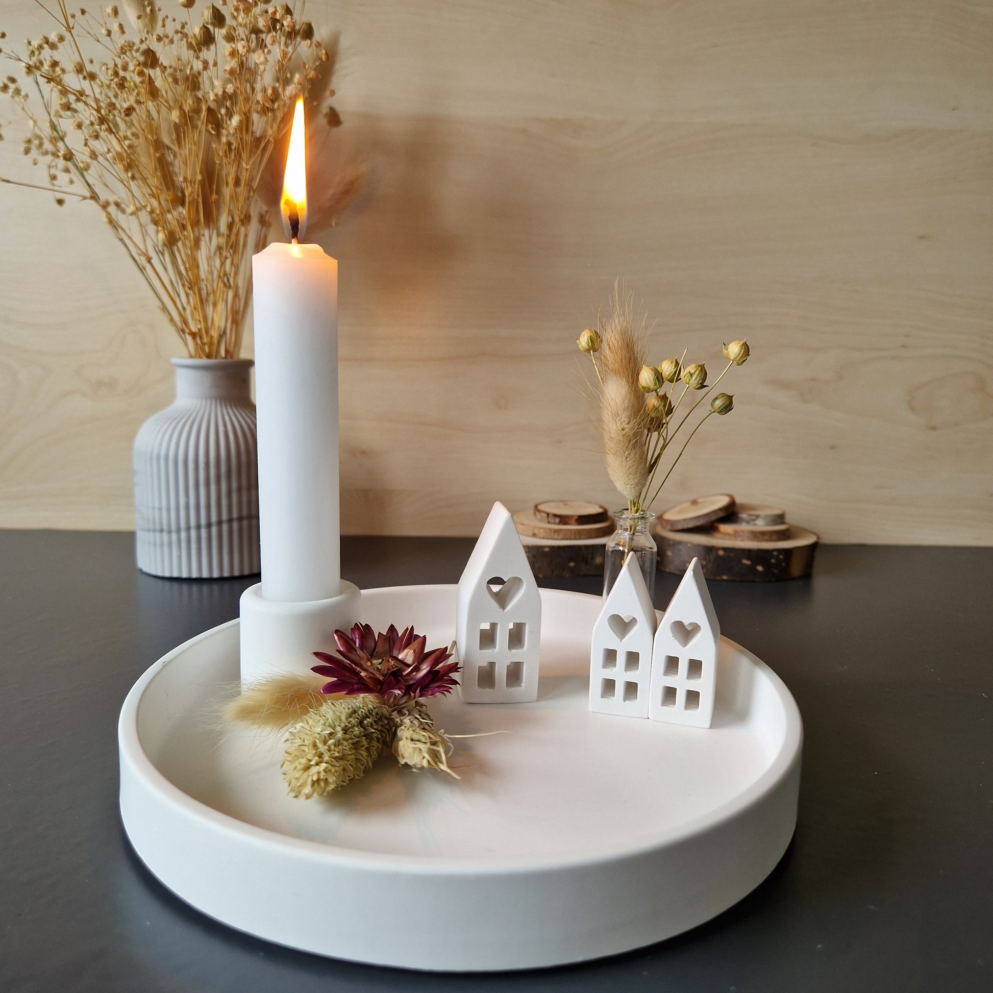 Set aus Dekoteller rund, 3 Häuschen, Stabkerzenhalter aus weißem Gießbeton, kleine Glasvase Trockenblumenstrauß und kurzer weißer Stabkerze