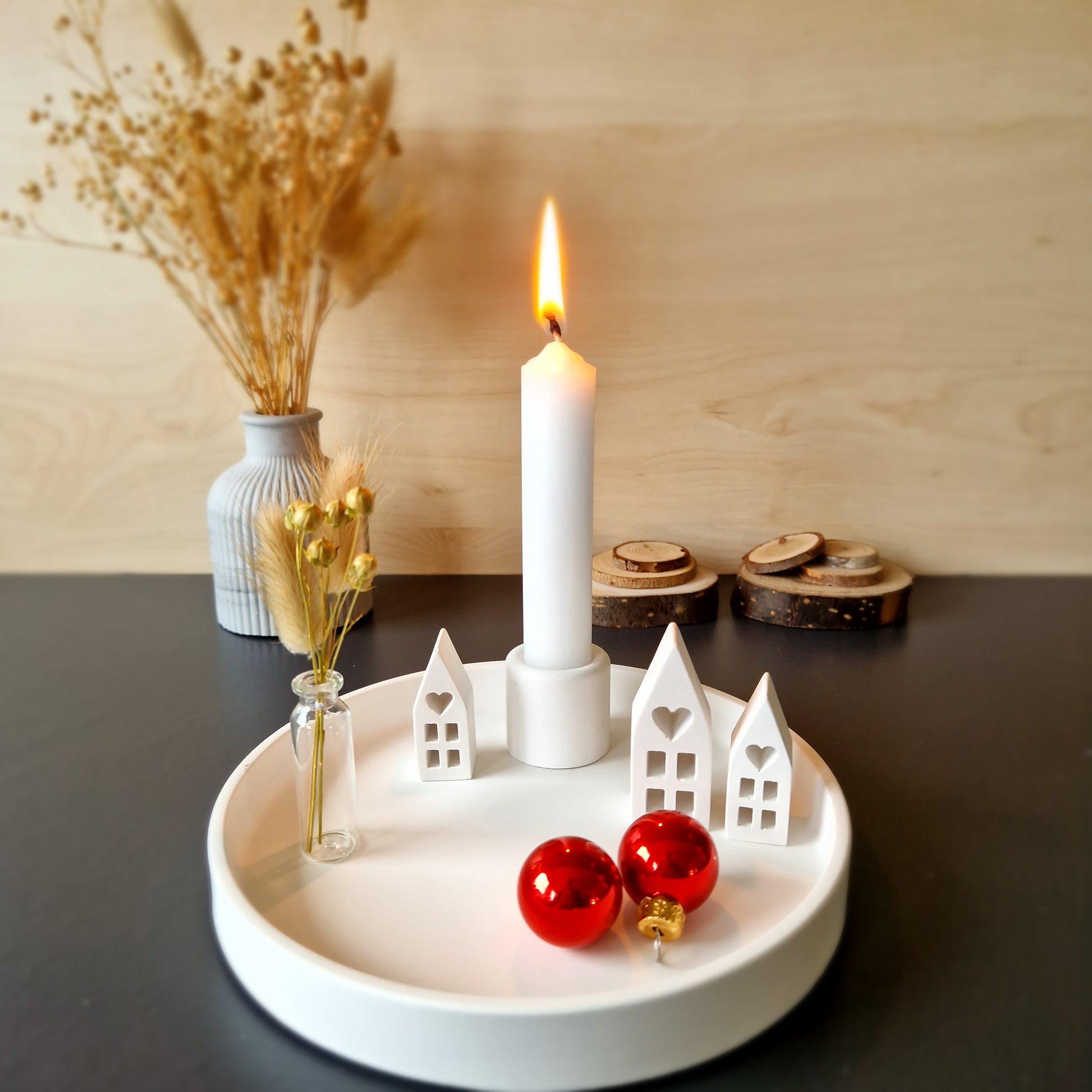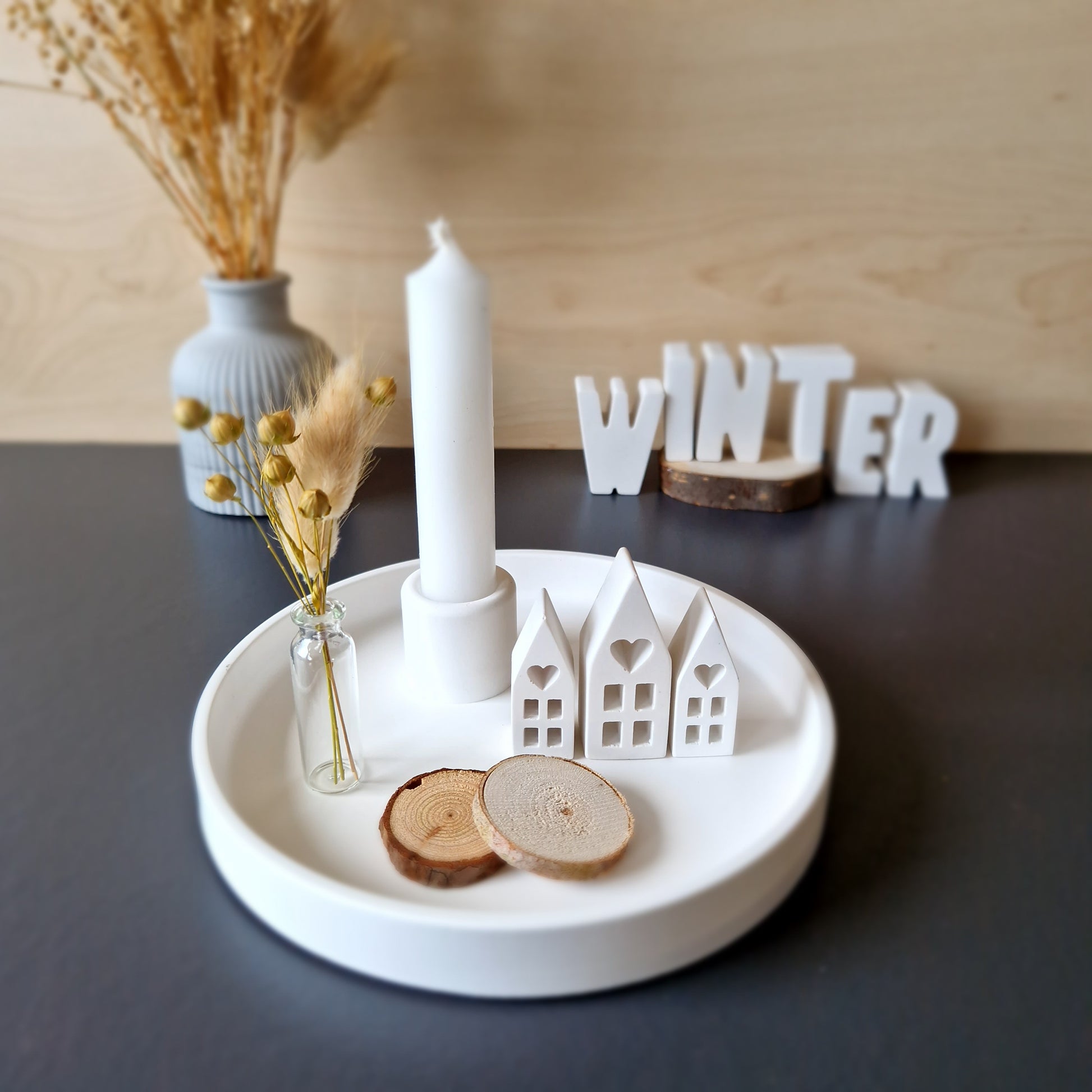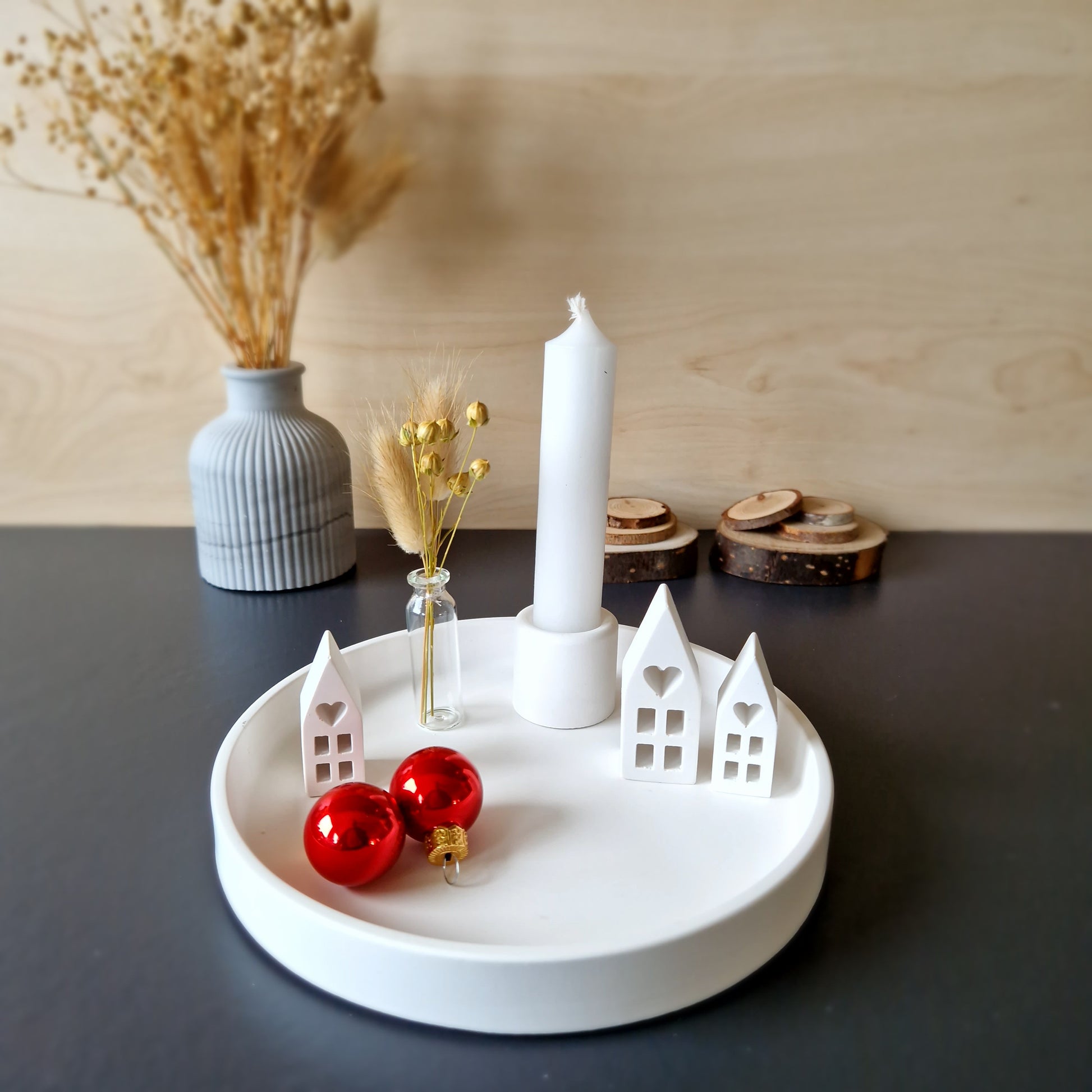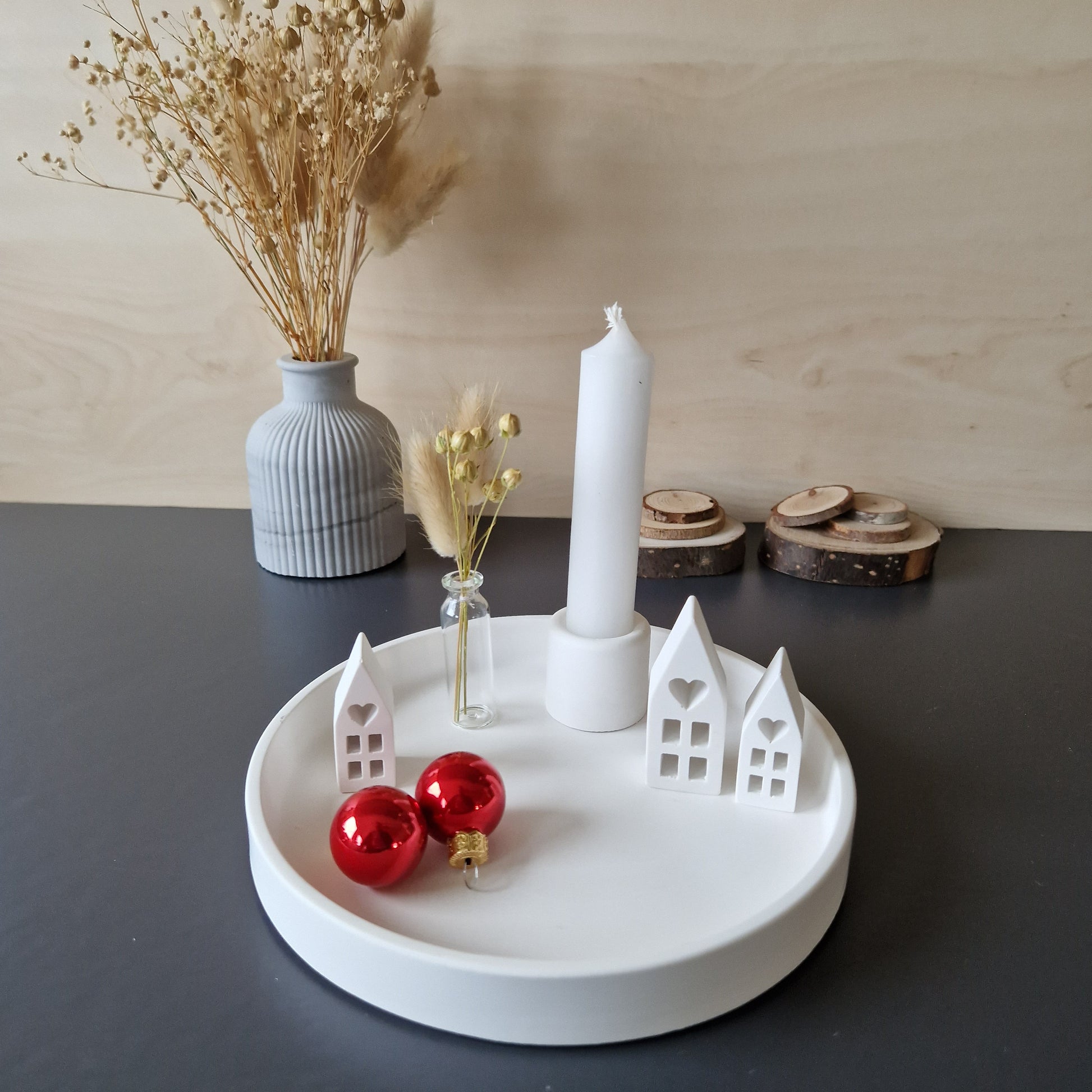 Set aus Dekoteller rund, 3 Häuschen, Stabkerzenhalter aus weißem Gießbeton, kleine Glasvase Trockenblumenstrauß und kurzer weißer Stabkerze